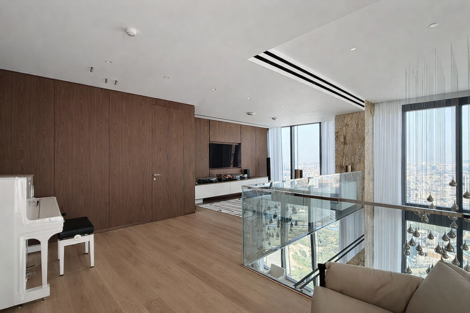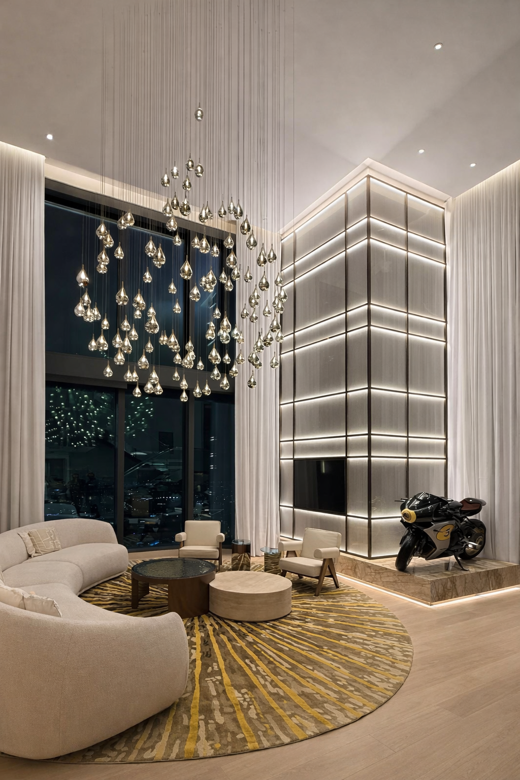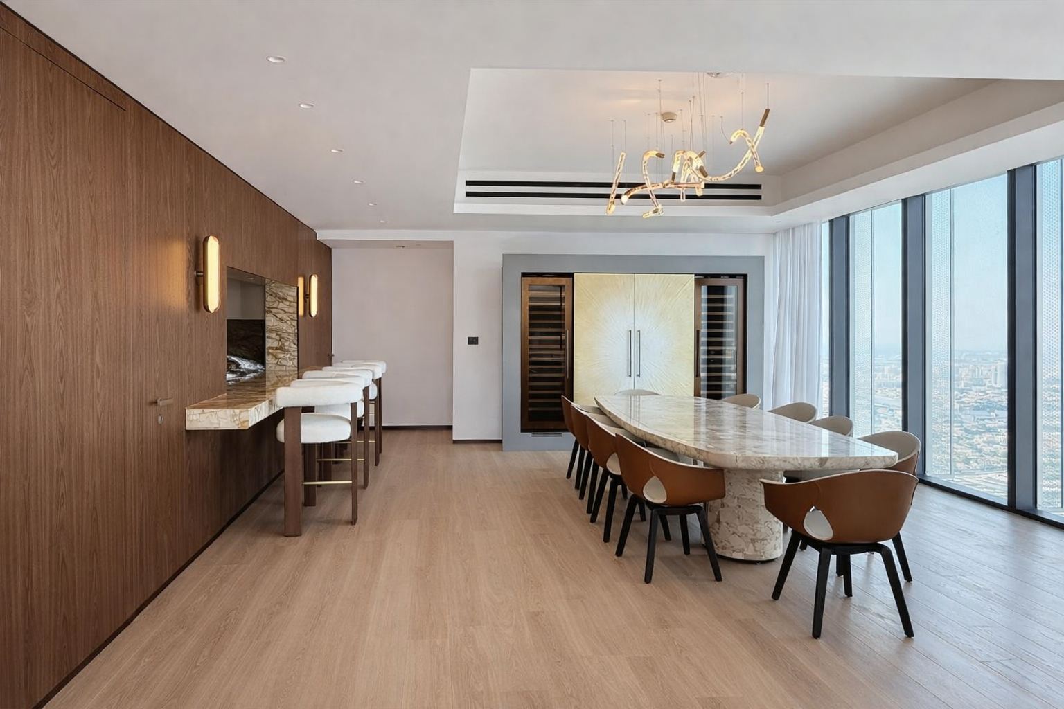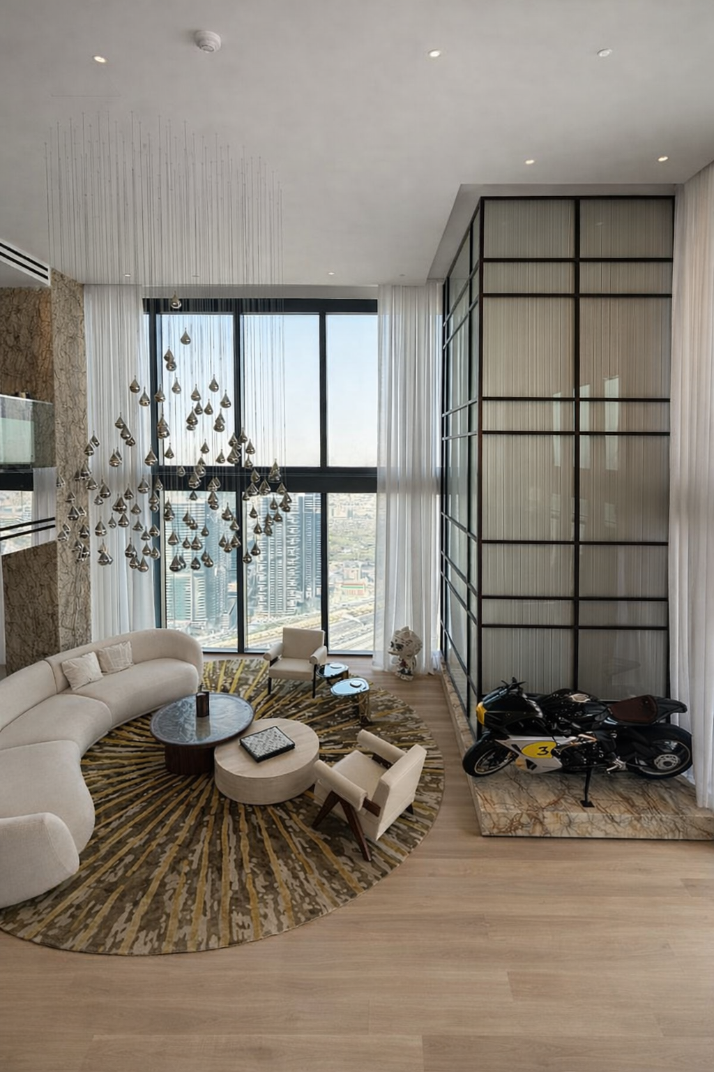 L’appartamento si sviluppa su grandi volumi, con doppie altezze, vetrate a tutta parete e una vista mozzafiato sulla città. Gli interni combinano marmo, vetro, metallo e superfici retroilluminate, creando un equilibrio sofisticato tra modernità e calore.