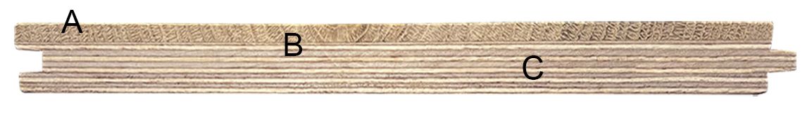 A - 1st Layer: Solid wood lamella stabilized by an individual seasoning and drying process. / B - Vinyl glue application providing excellent elasticity and long-lasting strength. / C - 2nd Layer: Plywood support for exterior use, providing greater durability over time against temperature changes.