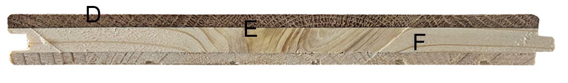 D - 1st Layer: Solid wood lamella stabilized by an individual seasoning and drying process. / E - Polyurethane glue application providing excellent elasticity and long-lasting strength. / F - 2nd Layer: Two-layer plywood support for exterior applications, providing enhanced durability over time against temperature variations.