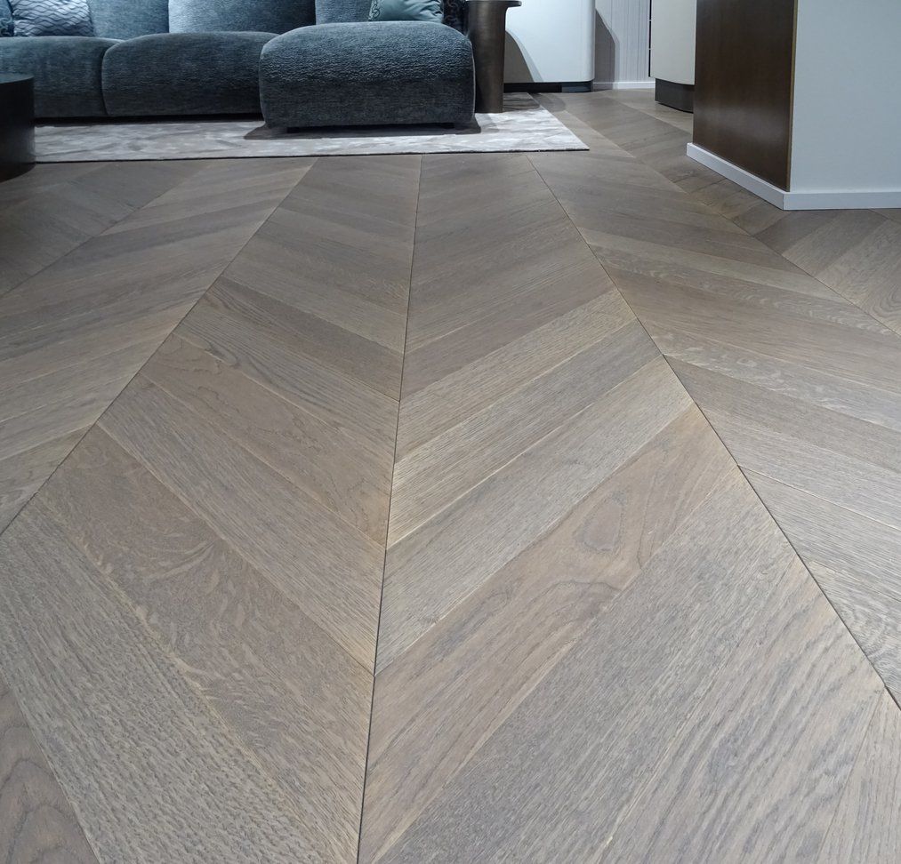 Wood Floor: Oak, Brushed, Stained Grigio NuvolaCollection: Chevron 45°, Modello Austria