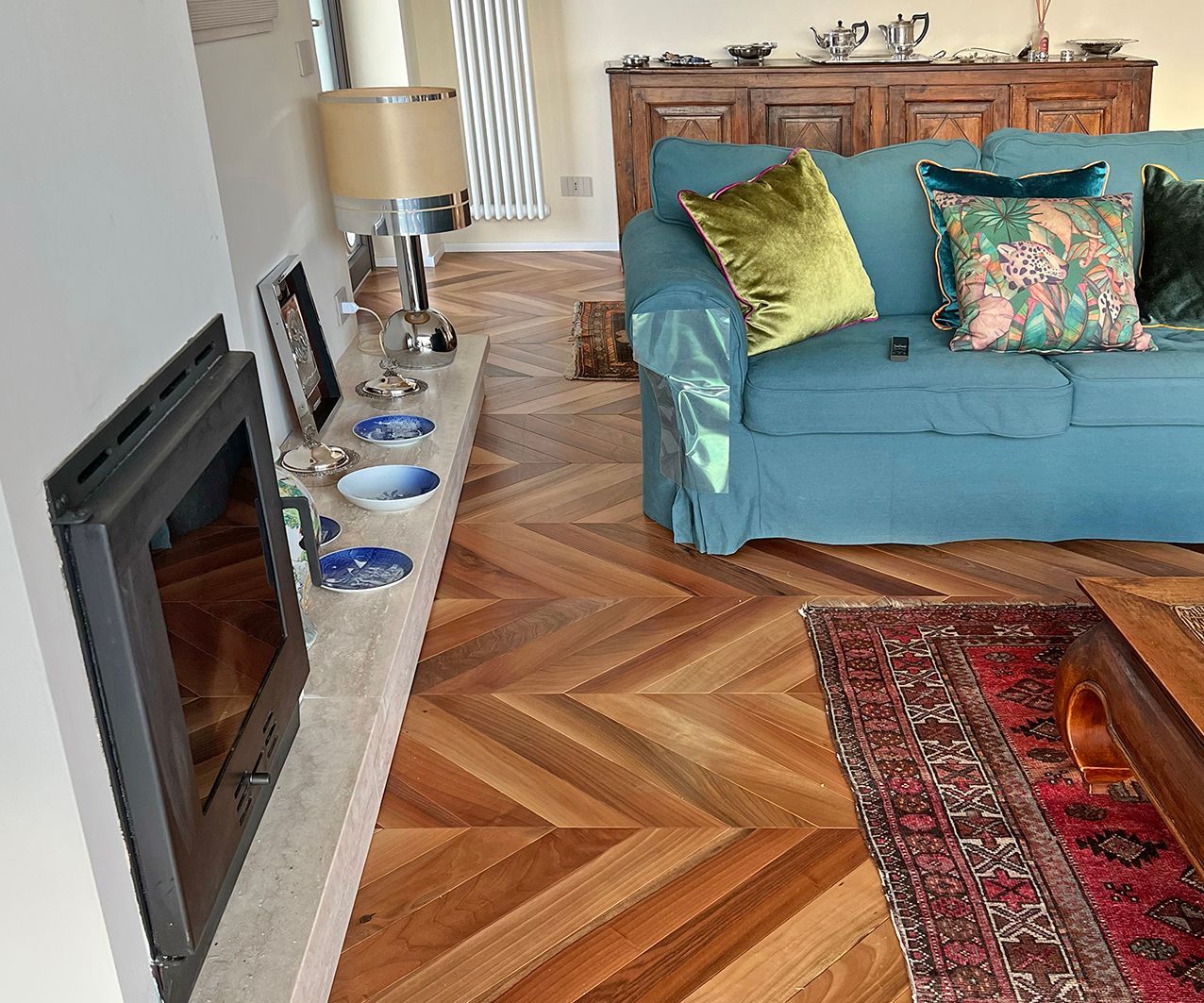 An important renovation project in Turin where we chose to overturn the spaces with our Parquet a Herringbone Hungarian. The European Walnut in this apartment highlights the elegant style even more, creating a familiar and sophisticated atmosphere that can best enhance the contrasting furnishings.