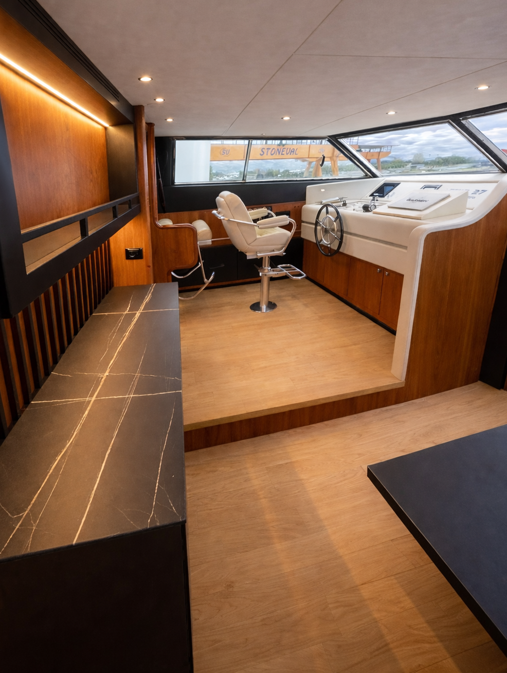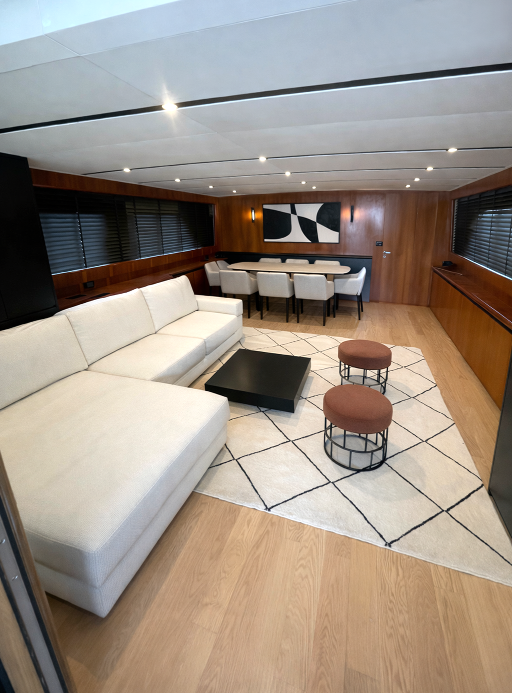Il legno, scelto per la sua naturale eleganza e per le elevate performance in ambiente marino, diventa il filo conduttore tra zona living, dining e plancia di comando. Le tonalità calde dialogano con rivestimenti in essenze pregiate, superfici laccate e dettagli in marmo e metallo, creando un’atmosfera sofisticata e accogliente.