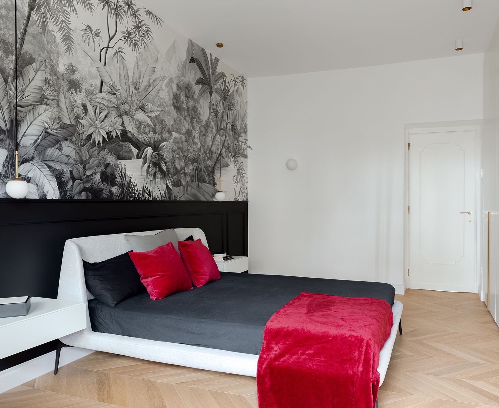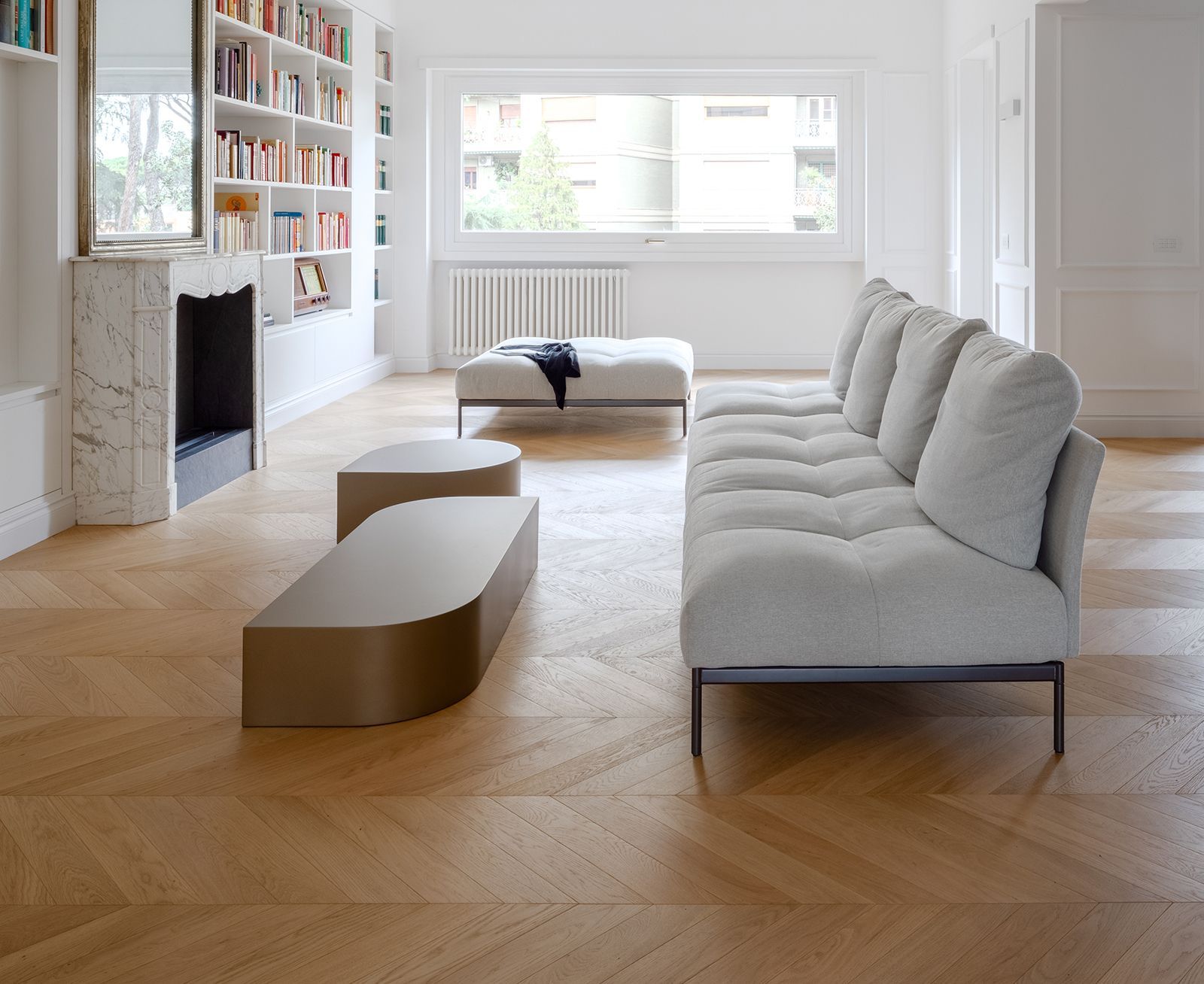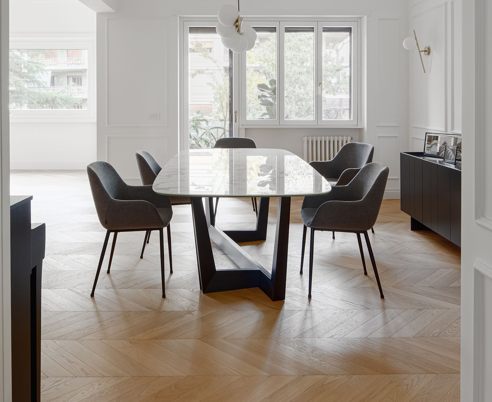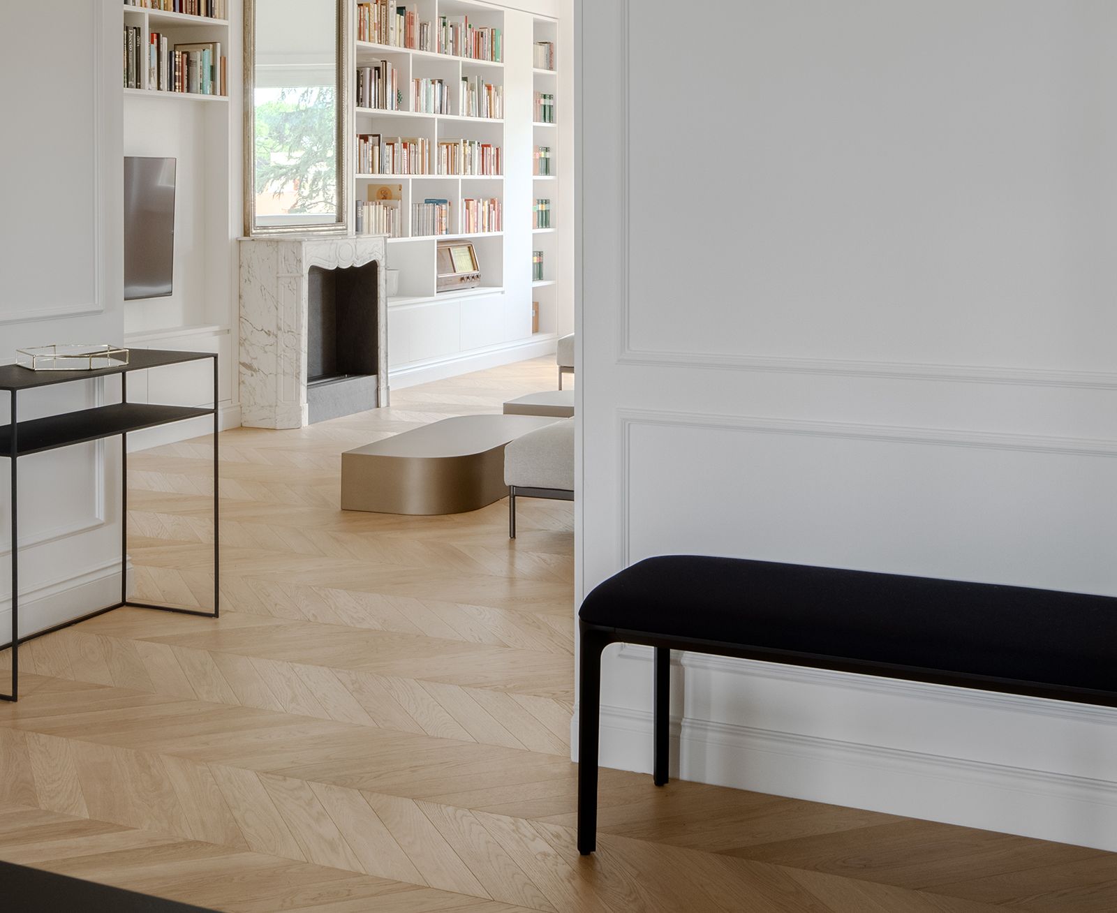 The choice of the Naturalizzato finish accentuates the materiality of the wood without compromising its natural appearance: a soft, matte, authentic surface that harmoniously blends with the contemporary furnishings and the refined geometry of the boiserie and existing architectural elements.