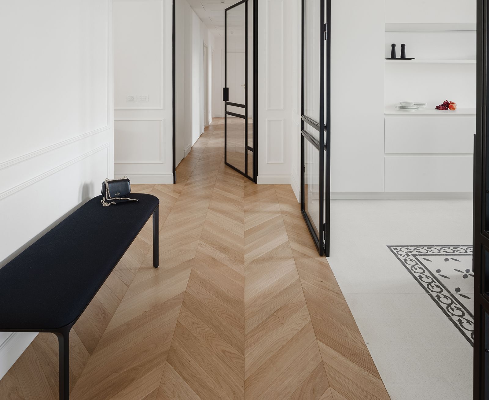 In this elegant residential project, the Hungarian Point parquet with a Naturalizzato finish becomes the quiet protagonist of the entire space. The dynamic texture of the Hungarian pattern engages in dialogue with the clean, luminous architecture, enhancing the depth of natural light and guiding the eye throughout the room.