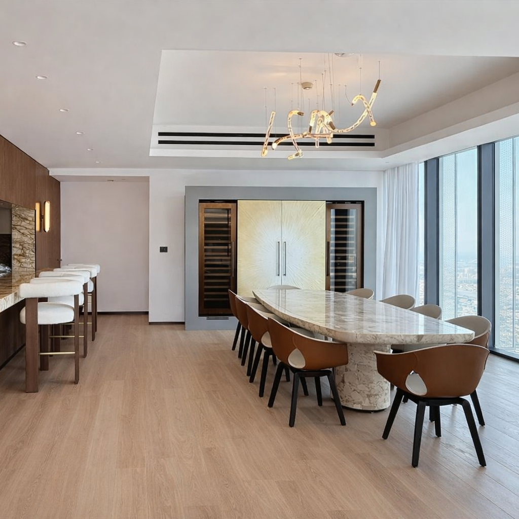 Parquet: Rovere, Spazzolato, T02 Naturalizzato Collezione: Doghe Nel cuore di Dubai, all’interno di una residenza privata di altissimo profilo, siamo stati coinvolti nella realizzazione della pavimentazione in legno di un progetto architettonico dallo stile contemporaneo e scenografico. Un intervento che ha richiesto precisione, sensibilità estetica e competenze tecniche avanzate. Il contesto: luce, verticalità e materiali nobili L’appartamento si sviluppa su grandi volumi, con doppie altezze, vetrate a tutta parete e una vista mozzafiato sulla città. Gli interni combinano marmo, vetro, metallo e superfici retroilluminate, creando un equilibrio sofisticato tra modernità e calore. In un contesto così materico e architettonicamente forte, il pavimento aveva un ruolo fondamentale: doveva scaldare l’ambiente senza appesantirlo, accompagnare la luce naturale e valorizzare arredi e dettagli. United Arab Emirates, Dubai – Residential Project Wood Floor: Oak, Brushed, T02 Naturalizzato Collection: Plank In the heart of Dubai, within a prestigious private residence, we were involved in the installation of the wooden flooring for a contemporary and visually striking architectural project. An intervention that required precision, aesthetic sensitivity, and advanced technical expertise. The context: light, verticality, and noble materials The apartment unfolds across generous volumes, featuring double-height spaces, full-height glazing, and breathtaking views over the city. The interiors combine marble, glass, metal, and backlit surfaces, creating a sophisticated balance between modernity and warmth. In such a materially rich and architecturally bold setting, the flooring played a fundamental role: it needed to bring warmth to the space without weighing it down, complement the natural light, and enhance the furnishings and architectural details.